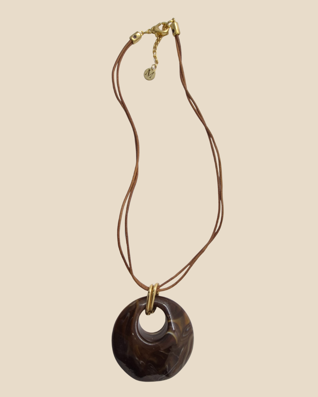 Colar de cordas duplas e pingente redondo grande de resina com furo e 2 elos dourados prendendo-o às cordas. Design exclusivo.