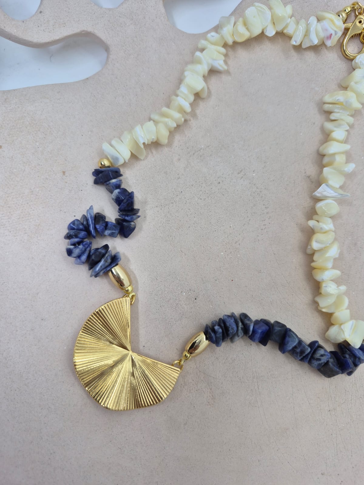 Colar pedras brancas e de cor em toda volta. Pingente em leque. Fecho e moeda da marca dourados. Design exclusivo.
