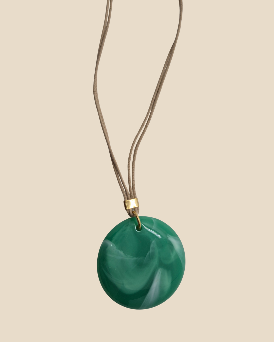Colar de corda dupla, com pingente redondo grande de resina, com acabamentos, fecho, moeda da marca e elos dourados. Design exclusivo.