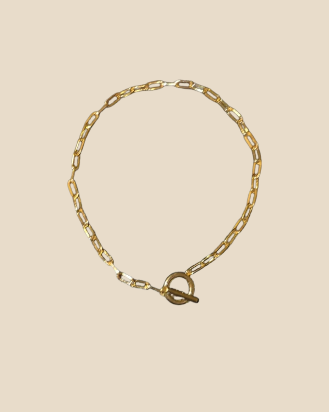Colar de elos médios, finalizado com fecho de círculo e ponta, dourado, na parte frontal. Design exclusivo.