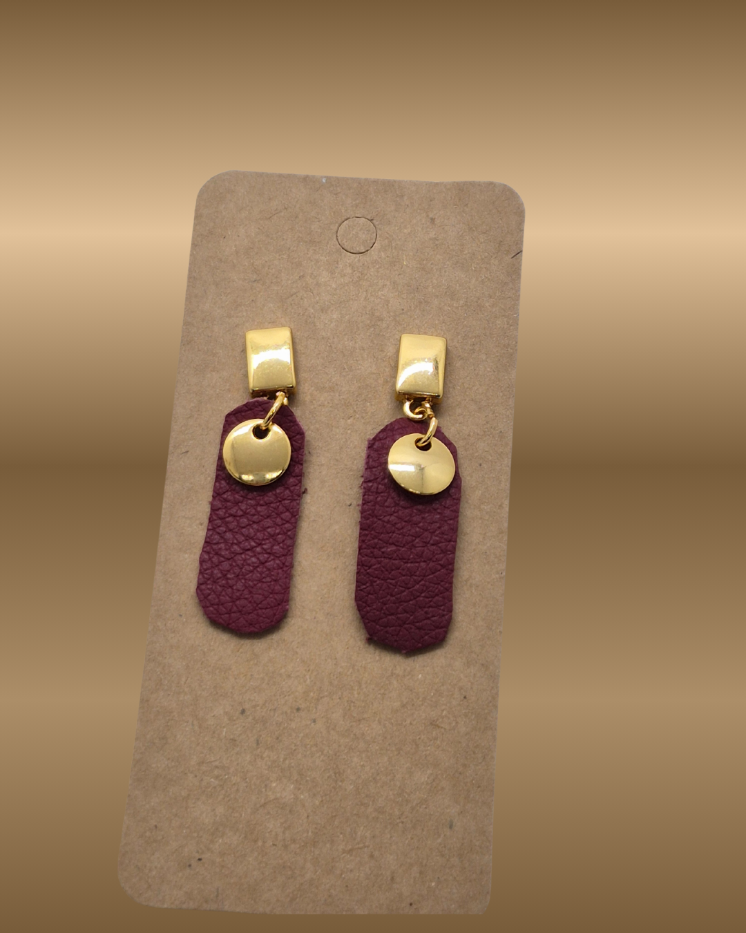 Brinco de couro pequeno com medalha, base retangular e elo dourados. Design exclusivo.