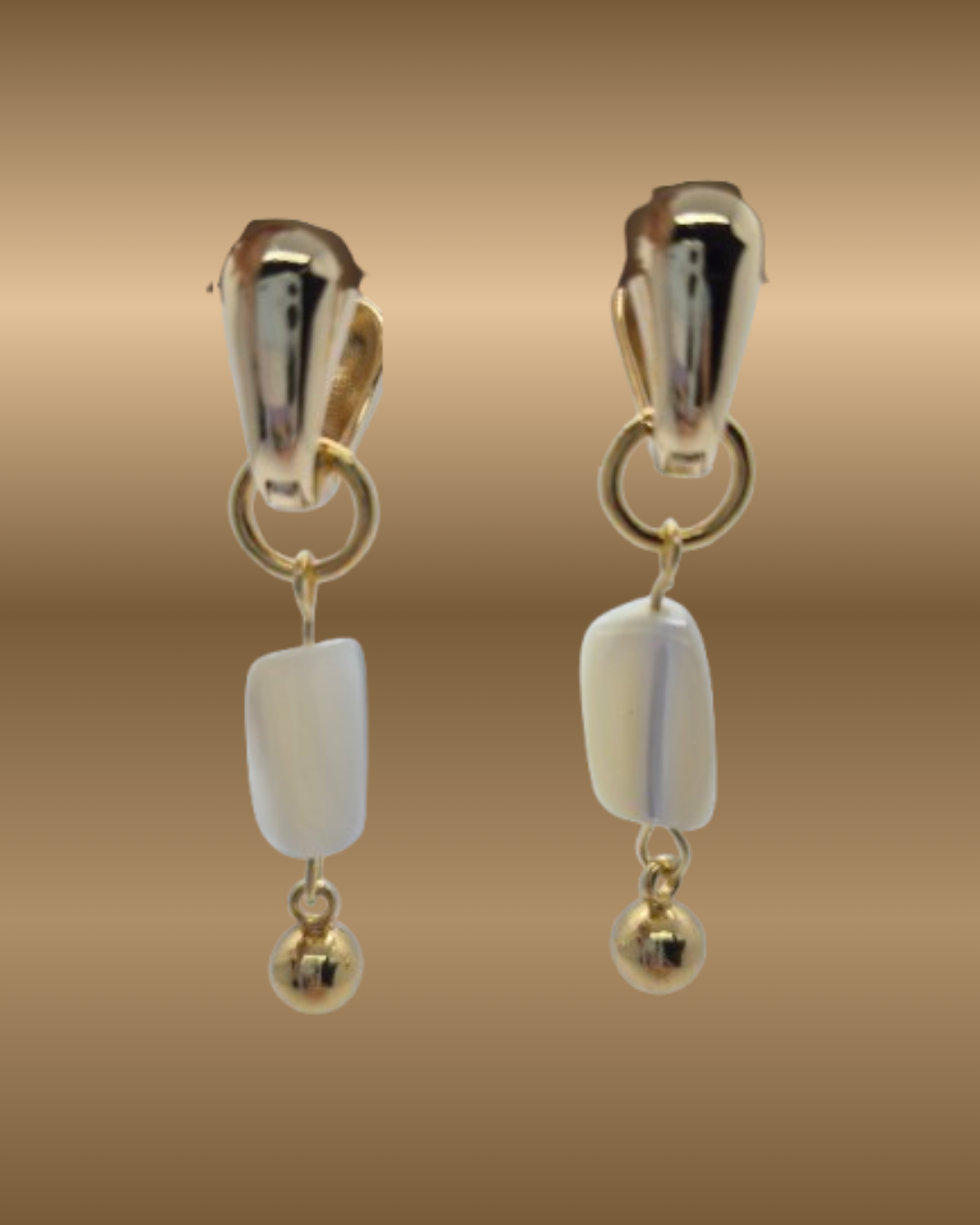 Brinco com base dourada robusta, com madrepérola e bola dourada pendentes. Design exclusivo.