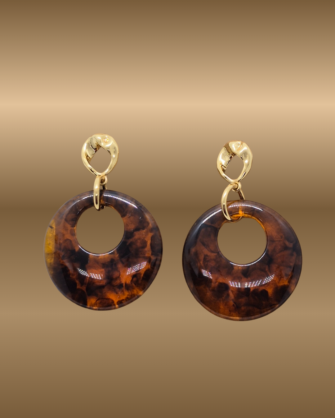 Brinco de resina redondo vazado, com base grande e 1 elo dourados. Design exclusivo.
