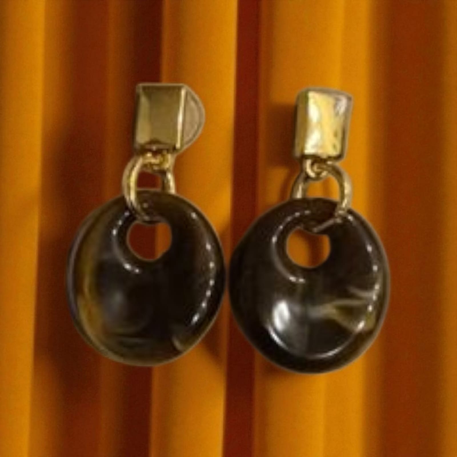 Brinco de resina oval vazado, com base dourada retangular, um elo dourado. Design exclusivo.