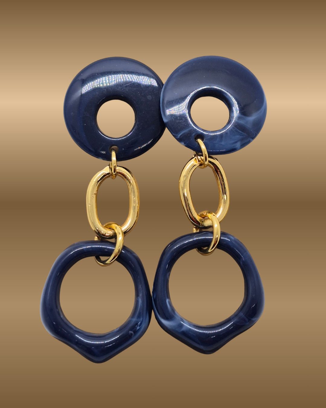 Brinco de resina, com base redonda e brinco esférico irregular, interligados por 3 elos dourados. Design Exclusivo.