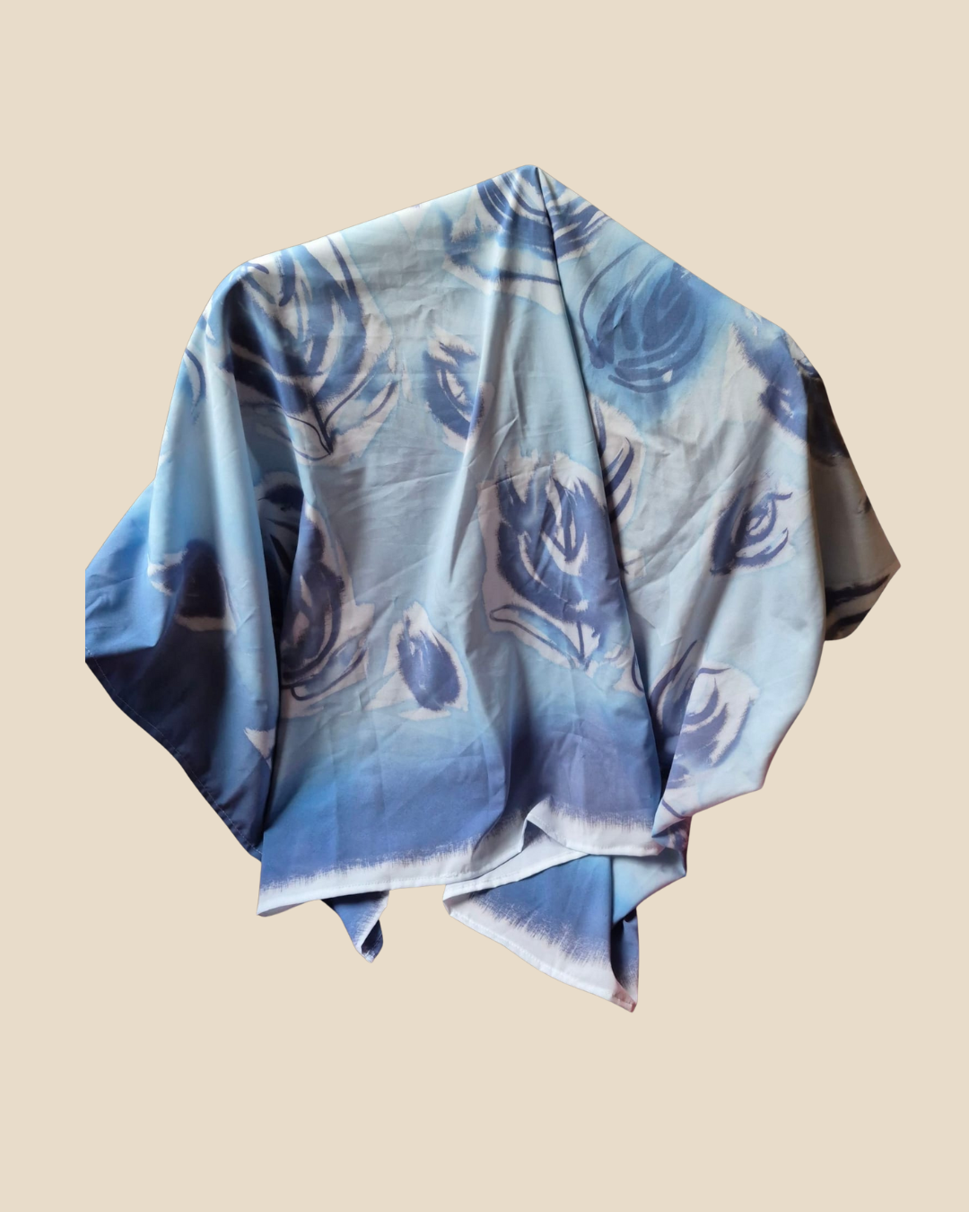 Canga de poliester 96% e elastano 4%, azul claro e escuro, com flores soltas. Pintada a mão. Design exclusivo.