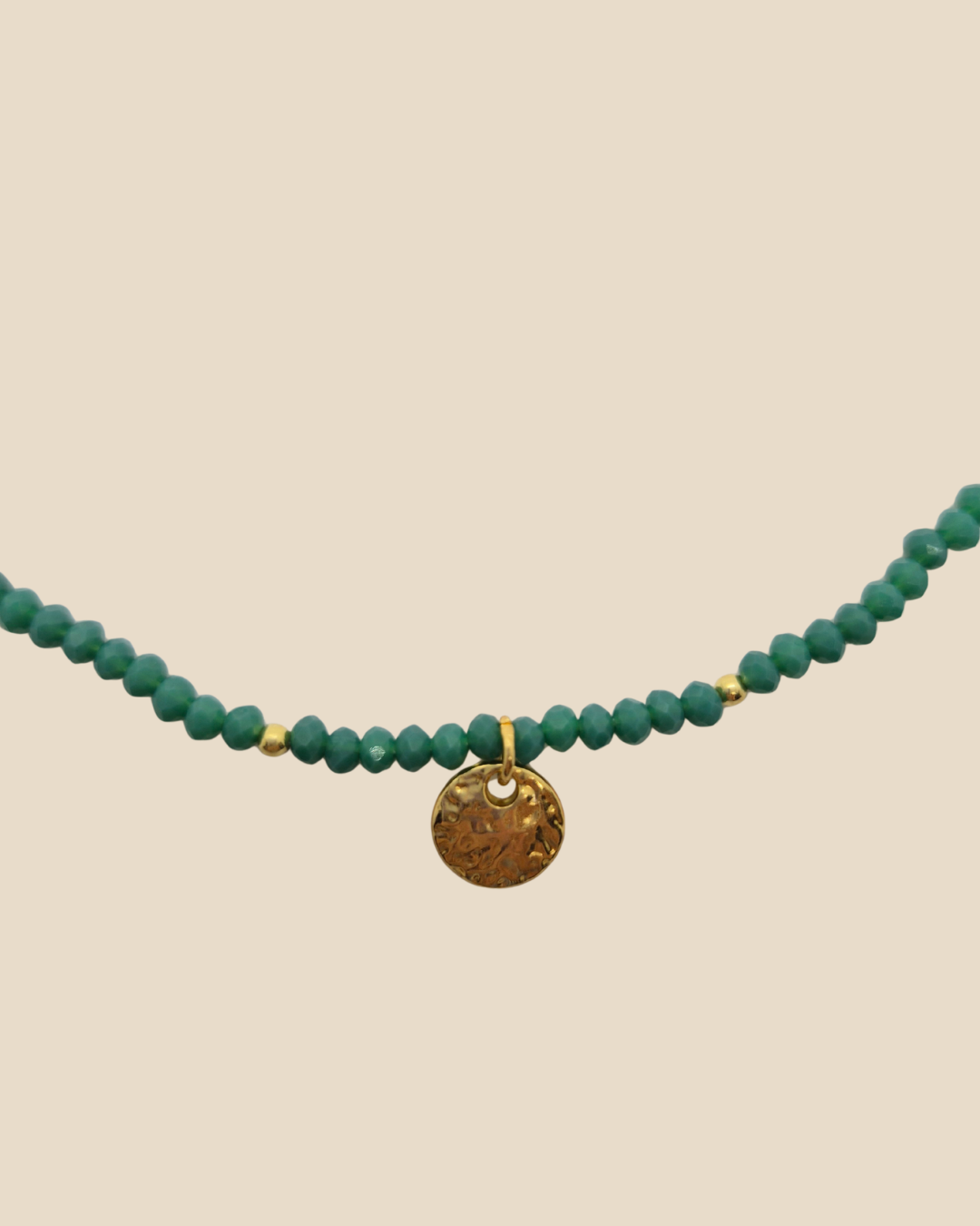 Colar de cristais bem pequenos, entremeado por elos dourados com pingente de pequena medalha redonda texturizada. Fecho e moeda da marca dourados. Design exclusivo.