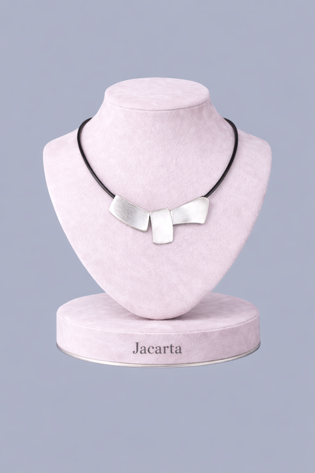 Colar prateado, composto por 3 peças irregulares, formando um desenho irregular em semi-círculo, sustentados por um fio de couro preto.