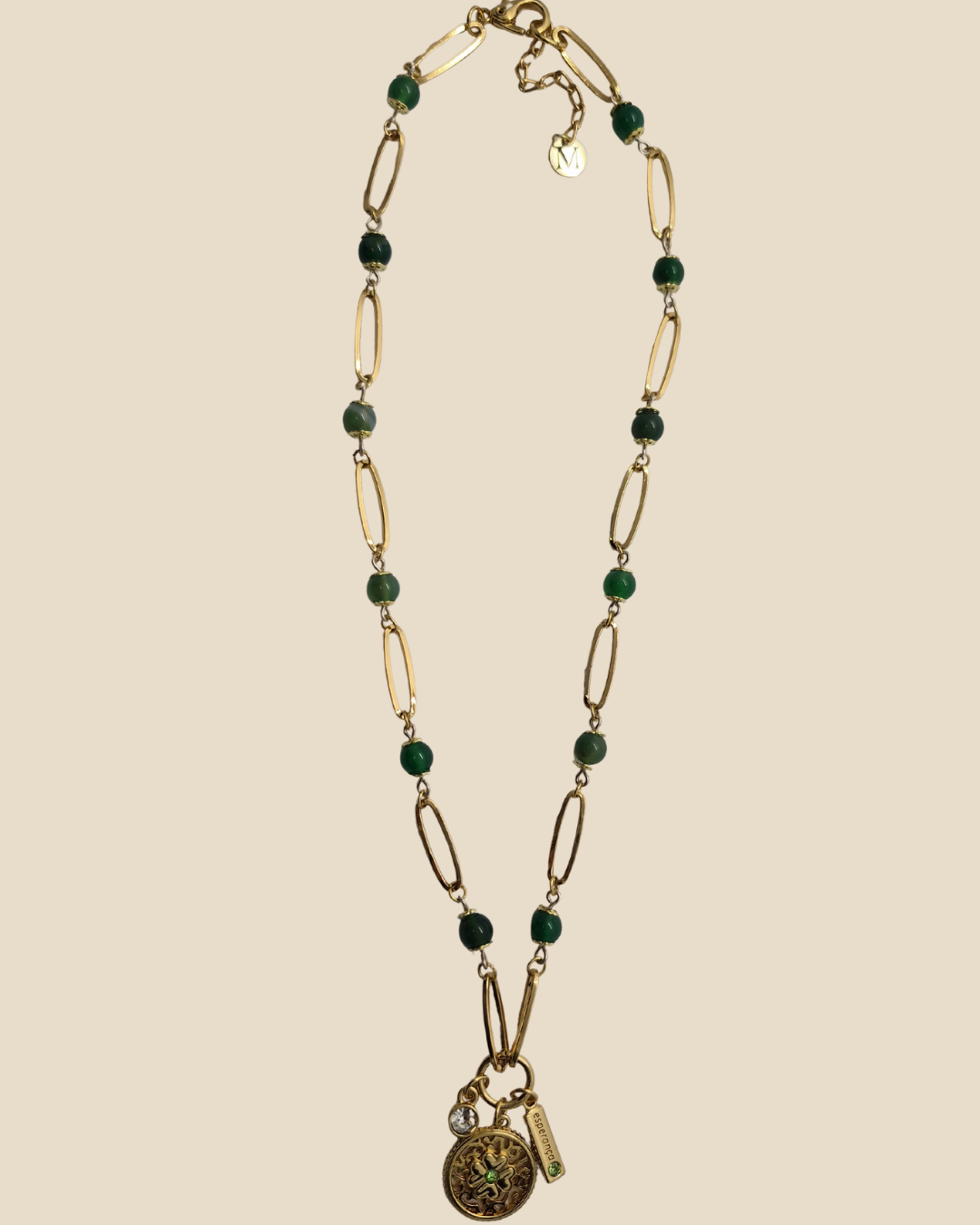Colar com elos dourados e cristais redondos e pingentes diversos. Fecho e moeda da marca dourados. Design exclusivo.