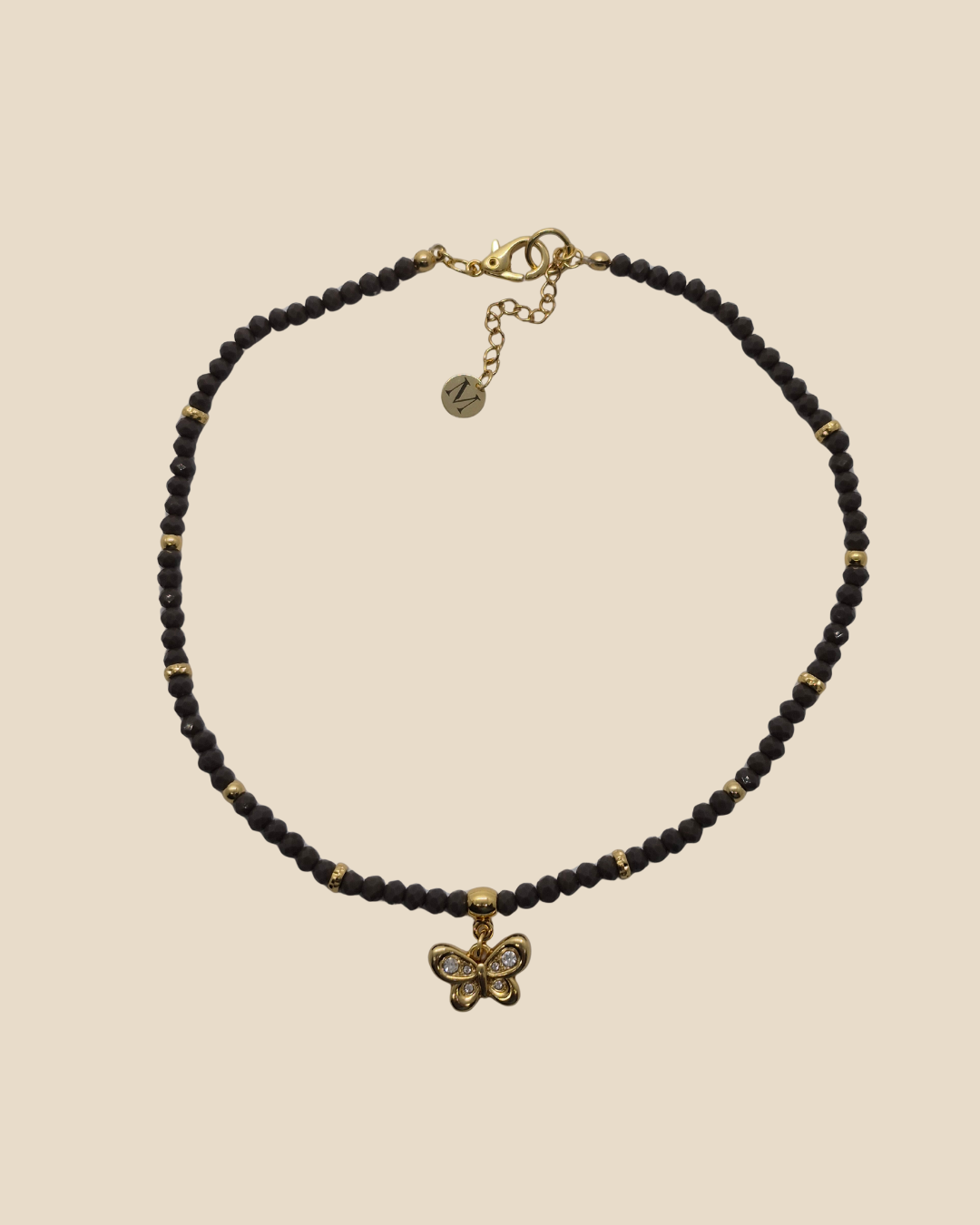 Colar de cristais entremeado por 2 tipos diferentes de elos, com pingente de borboleta dourada. Fecho, elos e moeda da marca dourados. Design exclusivo.