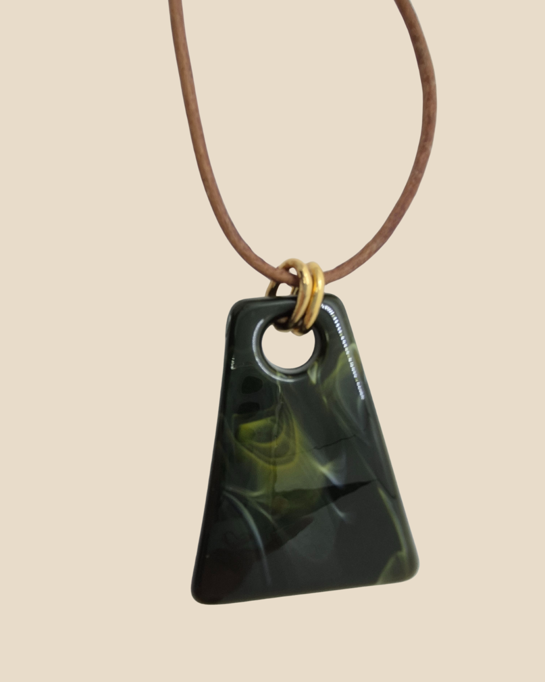 Colar com pingente de resina em formato de trapézio, com 1 corda de couroe 2 elos dourados. Design exclusivo.