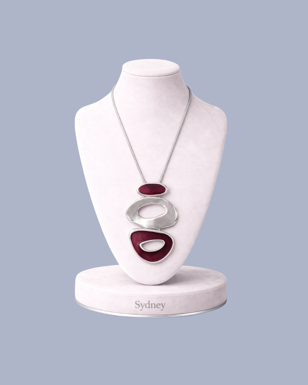 Colar de estanho com banho de prata, com pingente com 3 peças prateaddas, sendo a primeira e terceira pintadas de vinho. Fio prateado de 80cm que segura o pingente. Comprimento do pingente é de 7,5cm.