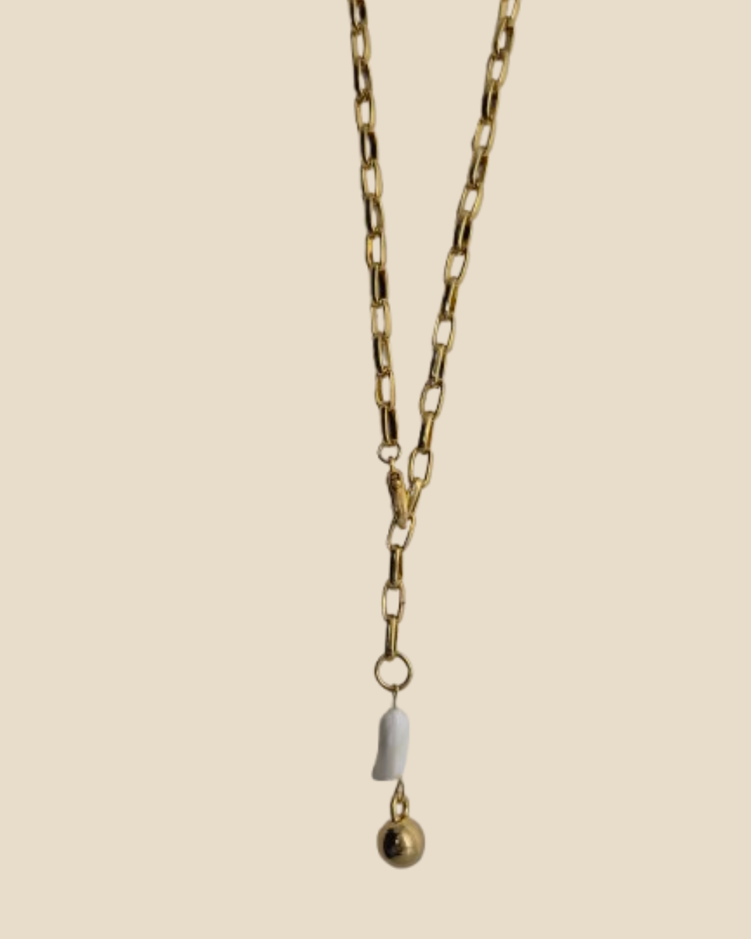Colar de elos dourados médios, com fecho na frente e pingentes de madrepérola e dourado. Design exclusivo.