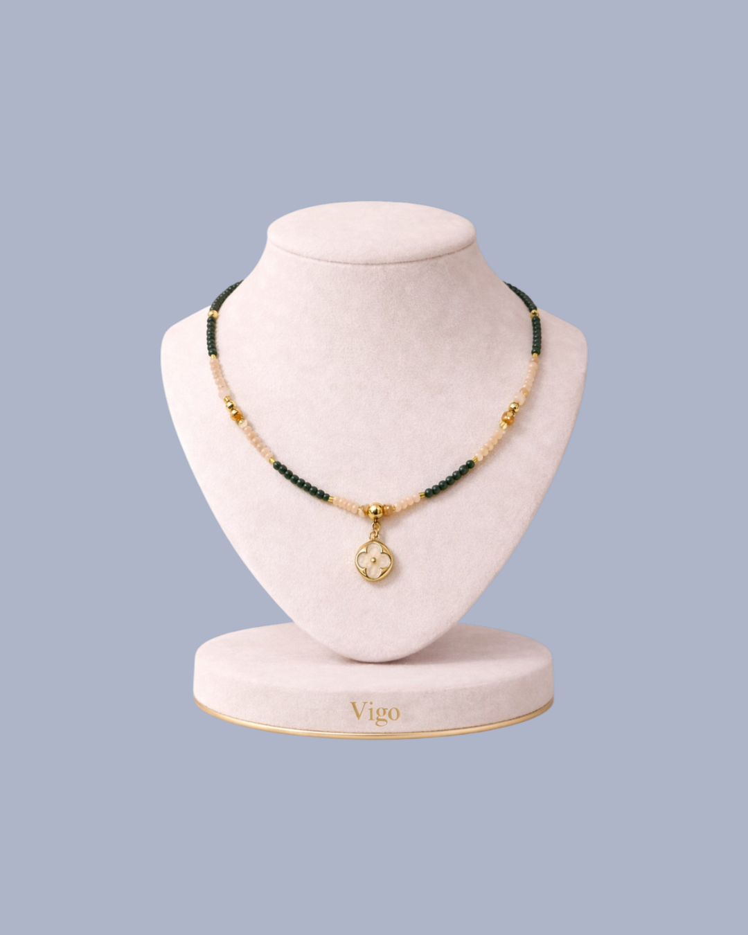 O Colar Vigo revela sofisticação em cada detalhe. A combinação de cristais facetados em verde profundo com tons nude suaves cria uma composição cromática elegante e atemporal, enriquecida por acentos dourados de acabamento refinado.