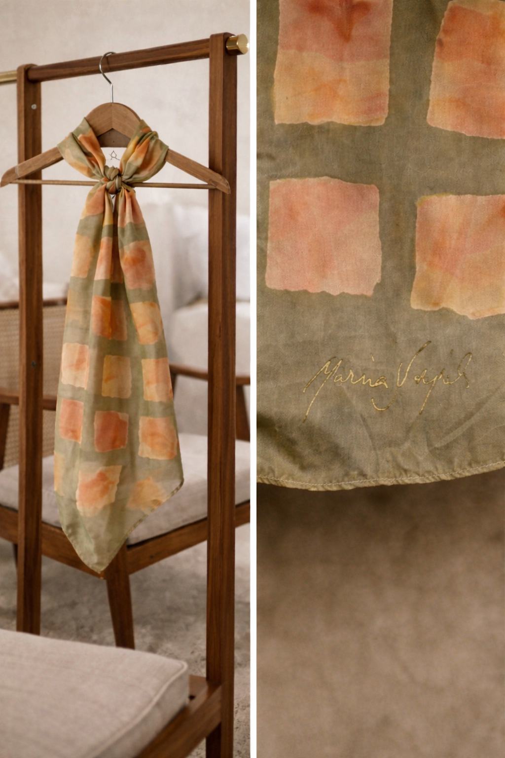 Lenço de Seda pura pintado a mão, com pinceladas em formato de retangulo irregulares, apresentando uma belíssima mistura de cores tom-sobre-tom. Assinado pela artista, exclusivo.