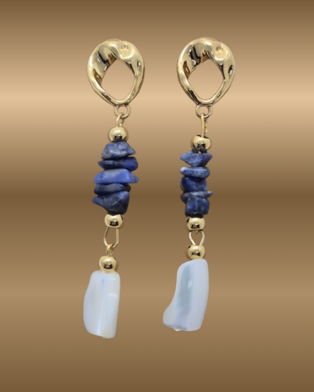 Brinco longo de pedras coloridas arrematado com peça de madrepérola. Base e elos dourados. Design exclusivo.