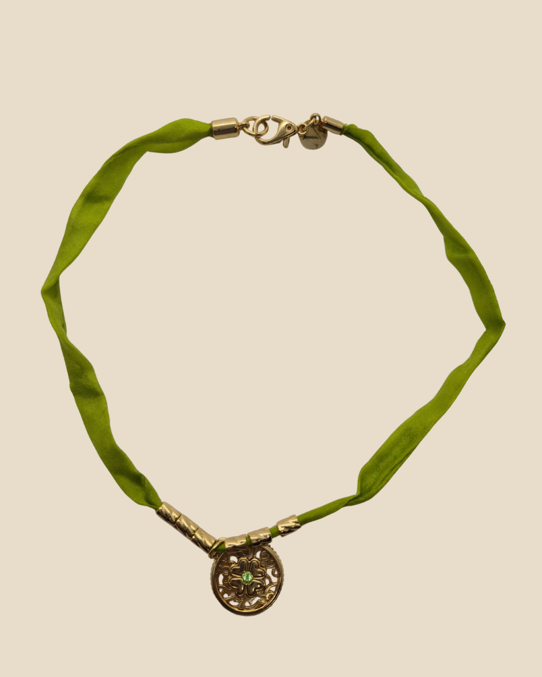Colar feito com seda pura e entremeado por canutilhos dourados. Fecho e moeda da marca dourados. Design exclusivo.